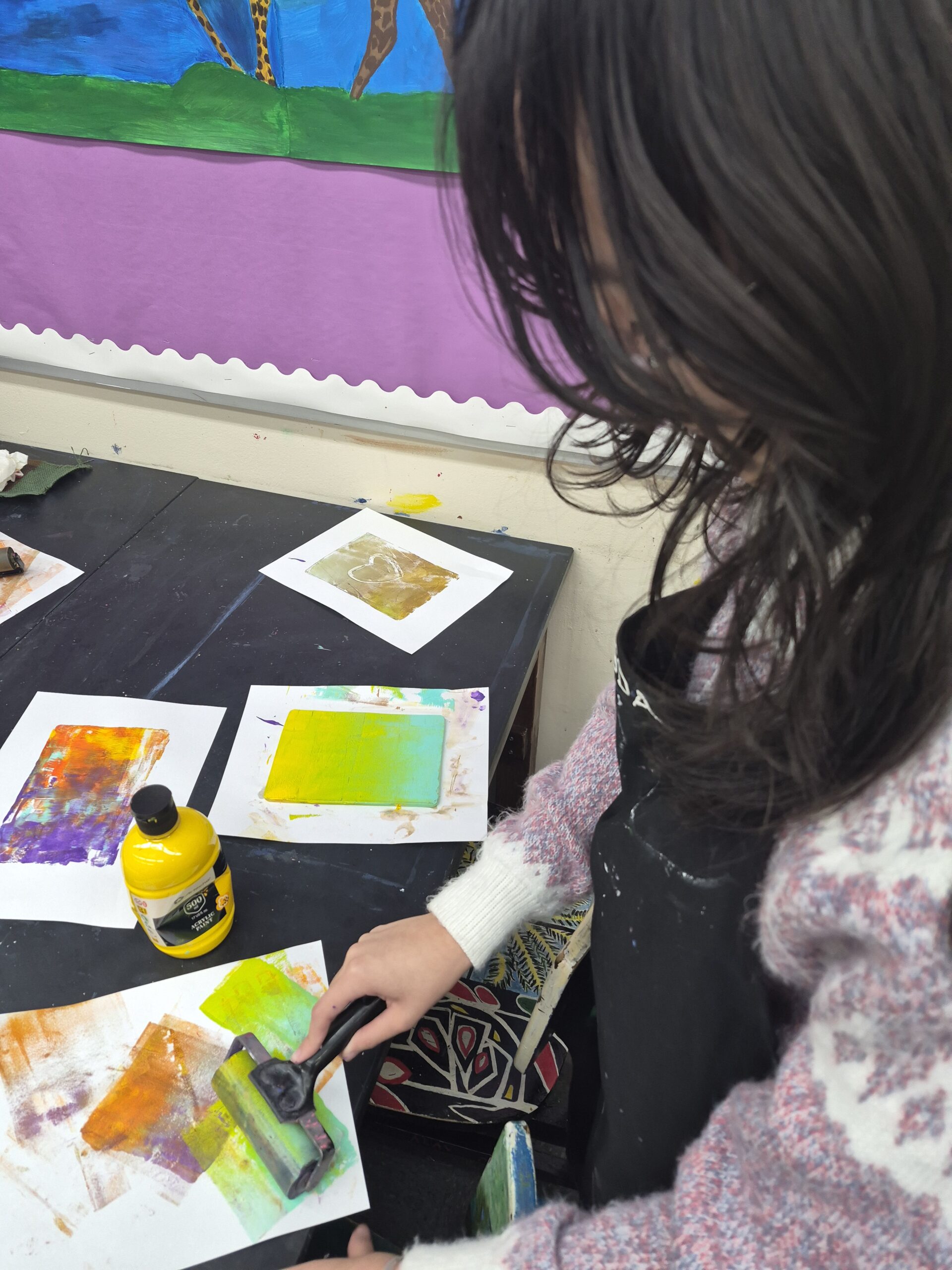 In art class, students explored Gelli printing, a simple yet expressive form of printmaking similar to monoprints. Using acrylic paint on flexible, reusable gelatin plates, students experimented with color, texture, and layering to create one-of-a-kind artworks on paper, no printing press required.